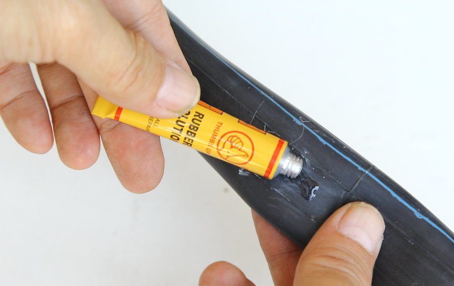 На заплатку наносят необходимое количество клея, затем ее плотно прикладывают к шине и прижимают. Держат в таком положении некоторое время, чтобы клей схватился. При необходимости обработанное место фиксируют при помощи груза и оставляют на несколько часов. После чего нужно проверить, насколько ремонт прошел успешно. Для этого камеру на велосипеде накачивают и просматривают, не выходит ли воздух. Если все хорошо, шину спускают и готовятся к сборке: