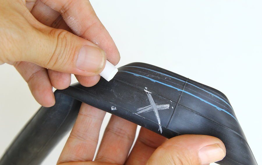 Обнаруженное место прокола необходимо пометить мелом. Обязательно стоит осмотреть шину со всех сторон, не осталось ли там посторонних предметов. Если таковые имеются, их нужно удалить перед заклеиванием.