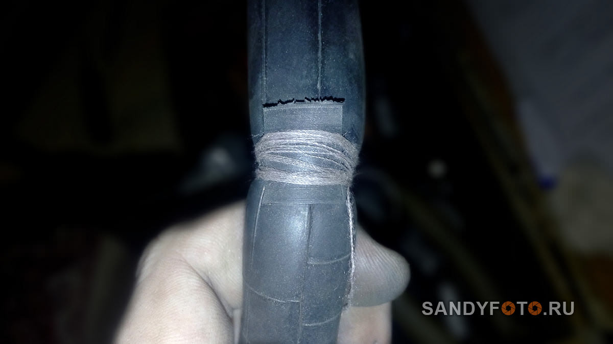 В поисках надёжного и недорогого метода для ремонта прокола в дороге я стал изучать интернет. Интернет, как известно, полнится различными народными способами. Большинство из них так или иначе связаны с клеем, но есть и совсем экстраординарные варианты. Например, мне встречалось описание метода при помощи нитки. «Как это ниткой можно исправить прокол?» — спросите вы. А вот так. Берётся нитка и ею перематывается камера в месте прокола. Существуют вариации: положить на место прокола заплатку из резины и уже сверху обмотать ниткой. Я решил протестировать этот метод лично. Получилось так: