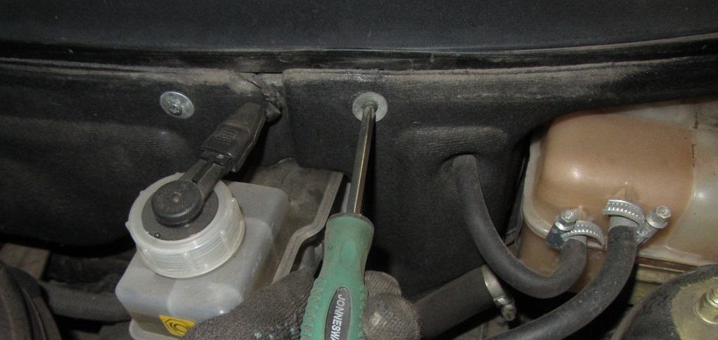 Снимаем уплотнитель капота с жабо и выкручиваем шурупы крепящие утеплитель. Затем демонтируем жабо.