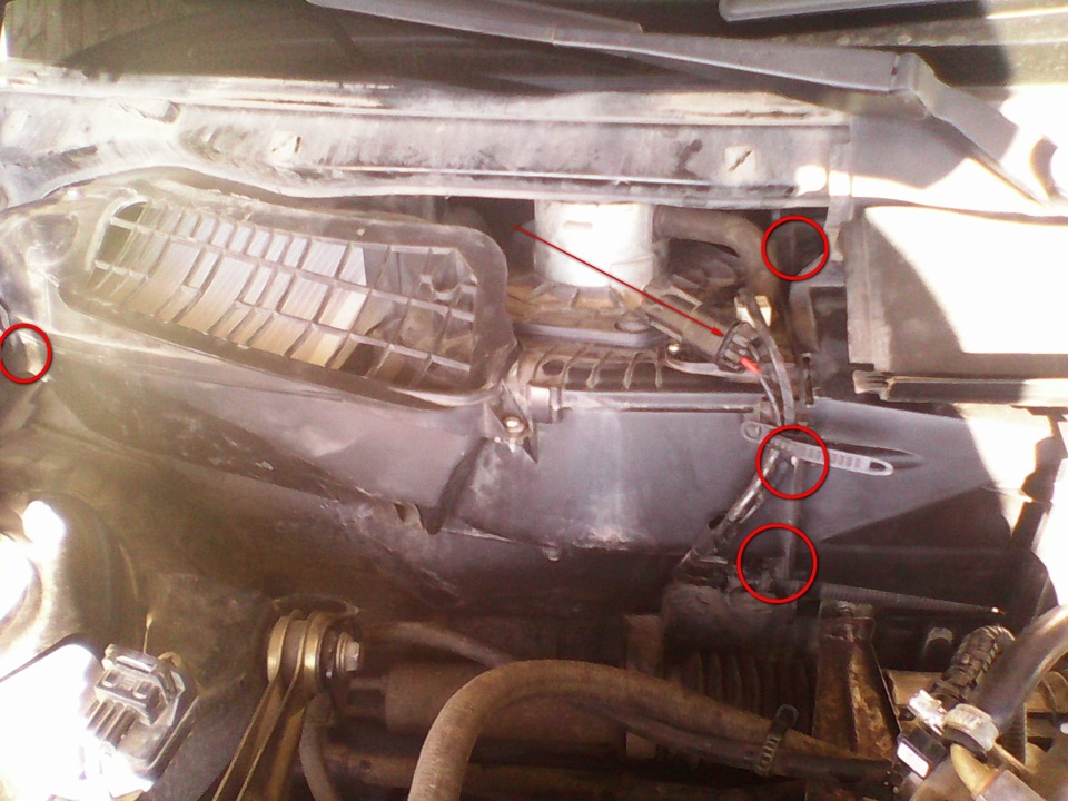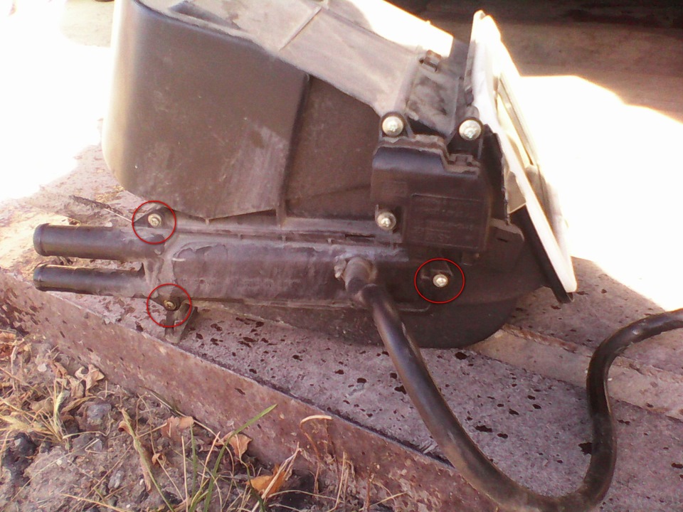 Далее на корпусе отопителя откручиваем 3 шурупа и 1 гайку, отмеченные на картинке красным кружком. Разъединяем штекер моторчика вентилятора и разъединяем корпус на две части.