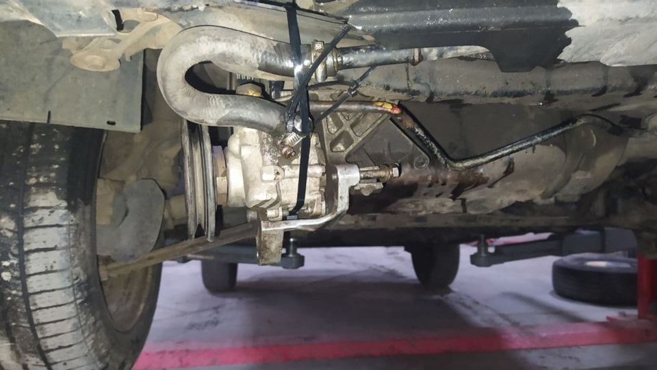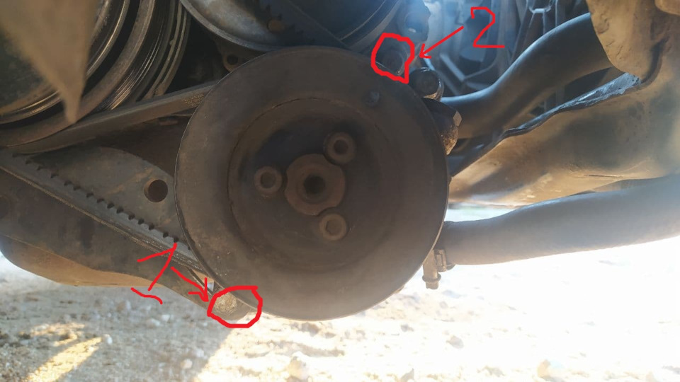 Первым делом я занялся извлечением термостата. Его корпус находится за кронштейном насоса ГУР, поэтому без его снятия не обойтись. (В процессе обнаружил два лопнувших уха крепления ) :