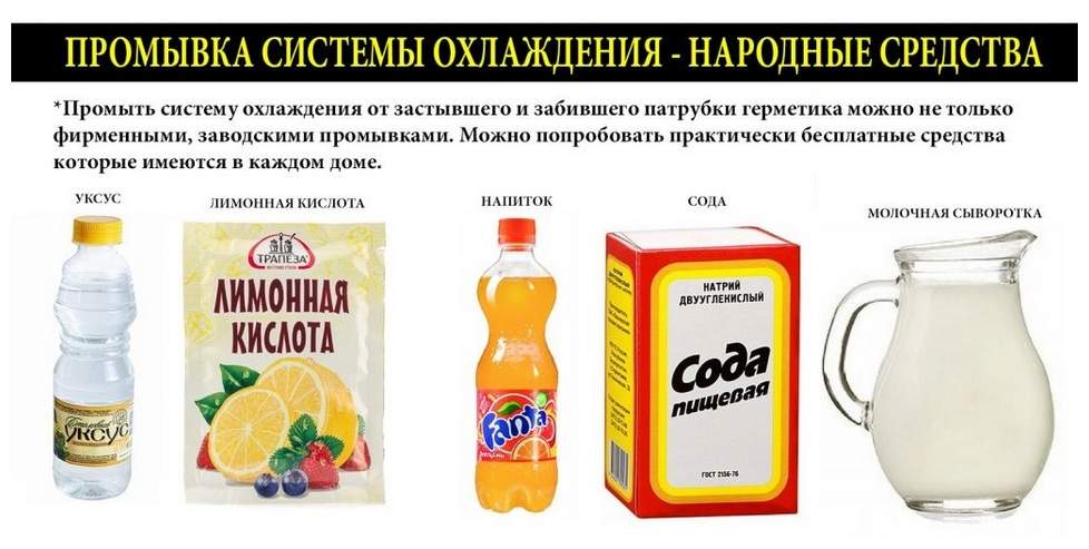 Для самостоятельной промывки системы охлаждения двигателя в качестве чистящего средства можно использовать следующие подручные средства.