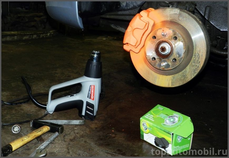 Машину поддомкрачивают и фиксируют, подставив прочные фиксаторы с целью обеспечения безопасности. Затем откручивают колеса. Проверяют техническое состояние суппорта, визуально осмотрев его. Потом снимают деталь. Она крепится на двух болтах, их откручивают. Если они не поддаются, нужно залить их WD-40 или постучать по ним. Если этот способ не срабатывает, должен помочь нагрев узла в печи.