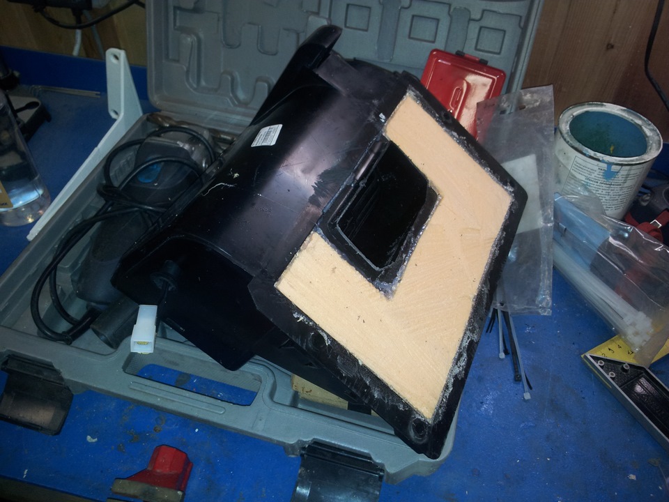 Оставшуюся полость монтажной запоняем пеной! Затем, после застывания, вровень ее срезаем с нижней частью корпуса воздухозаборника.