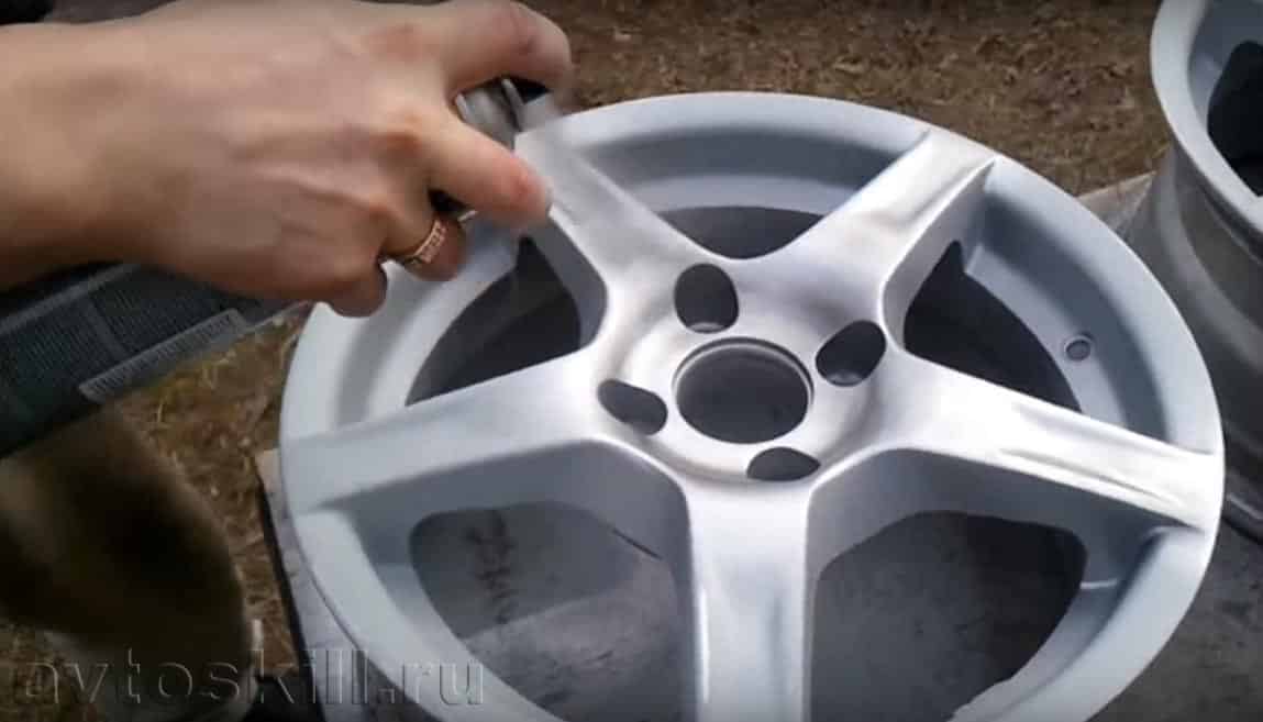 После уборки пыли обод нужно обезжирить. Для этого может подойти спирт, бензин либо специальное средство. Если резина осталась на автодиске, то ее понадобится закрыть при помощи клеенки и закрепить малярным скотчем. Так покрасочный материал не попадет на резину и не испортит весь вид.