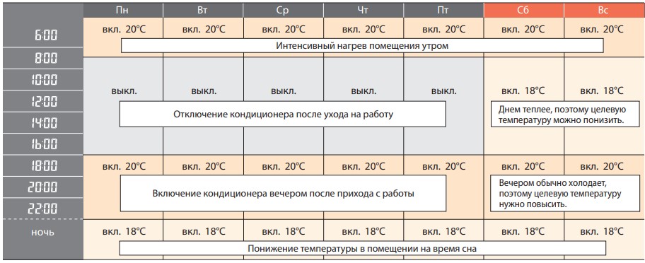Рис. 8. Пример использования таймера при работе кондиционера на обогрев