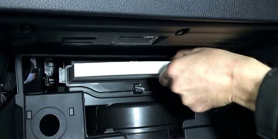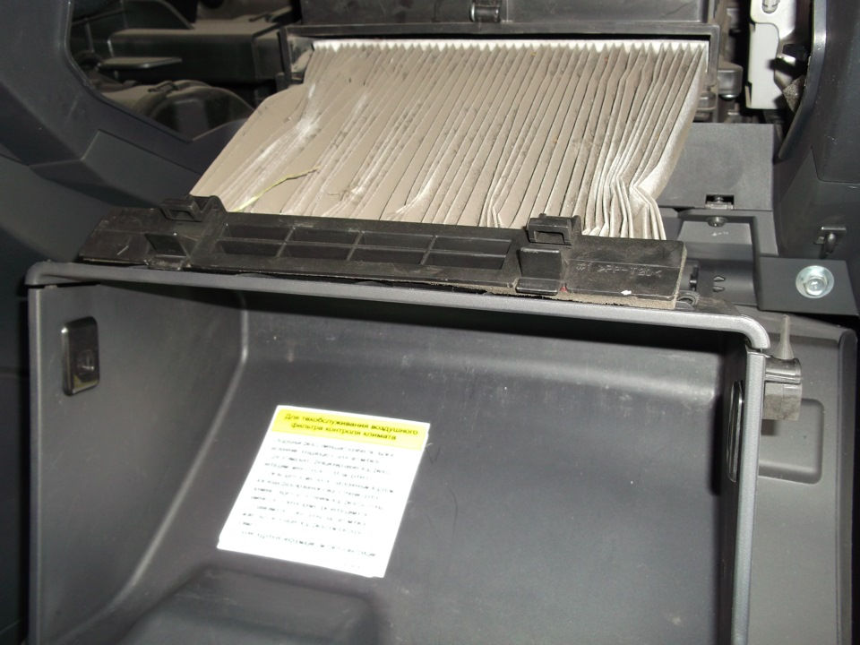 Сначала надо открыть бардачок и снять ограничитель сбоку. Затем снять саму полку бардачка, сжав ее стенки. После этого можно опустить полку вниз и получить доступ к крышке салонного фильтра.