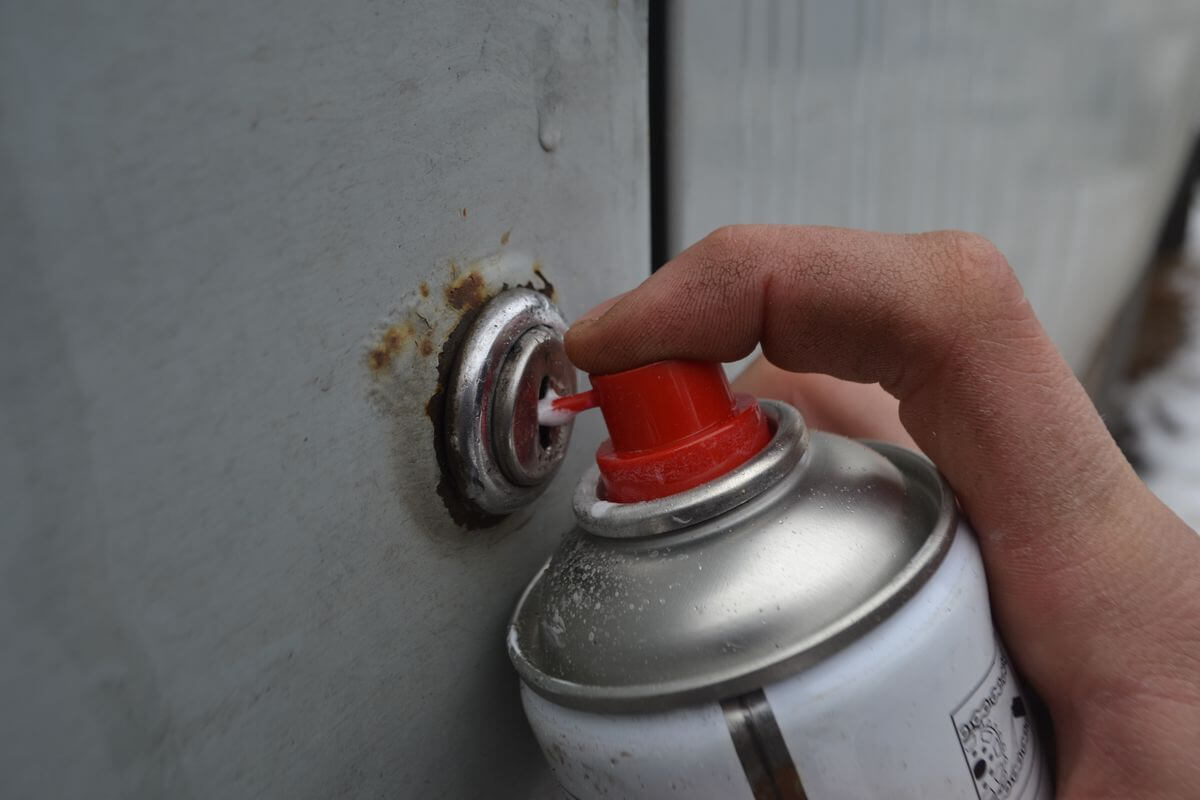 - Есть готовые средства — размораживатели замков на силиконовой основе. Они продаются в баллончиках. Достаточно пару раз распылить в замок, немного подождать, и дверь быстро откроется.