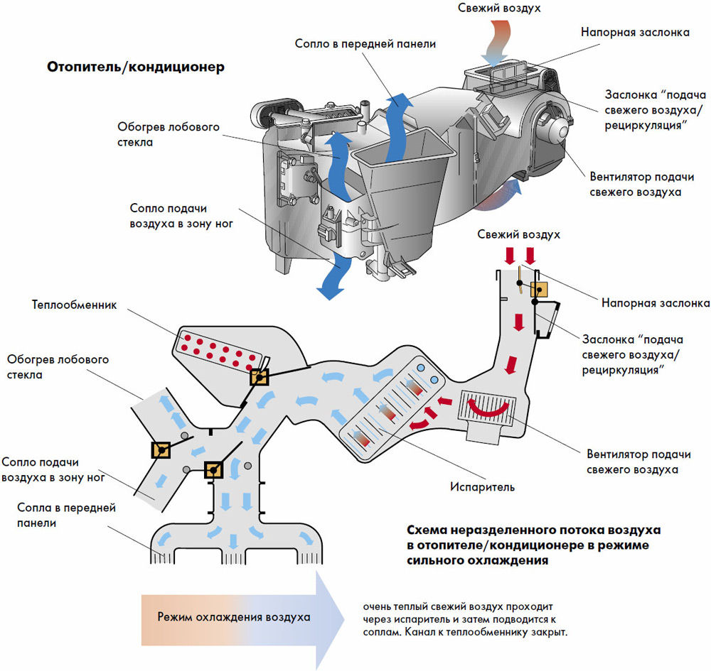 Заметим, что большинство элементов конструкции печки функционируют именно при включенной системе кондиционирования, поскольку теплообменник его испарителя, а также некоторые части отопителя, располагаются в одном блоке.