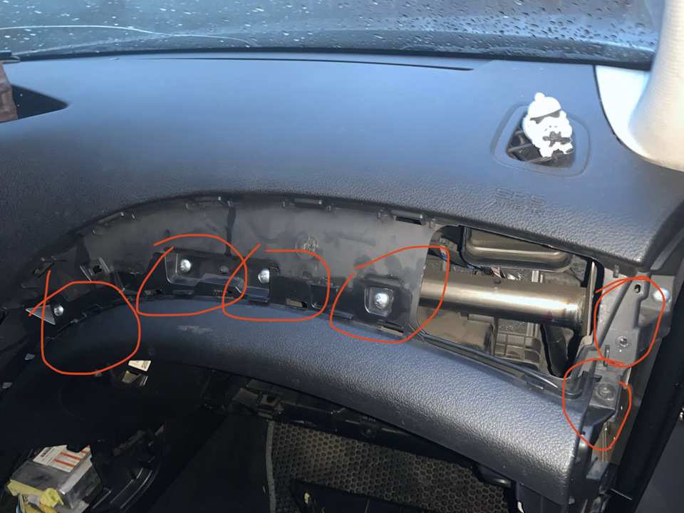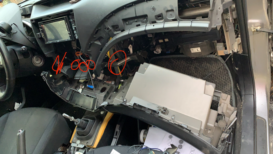 и начинается самое мучительное 5 болтов скрытых за усилителем торпеды три болта в пространстве под магнитолой нащупать можно руками в районе розетки и два болта по бокам