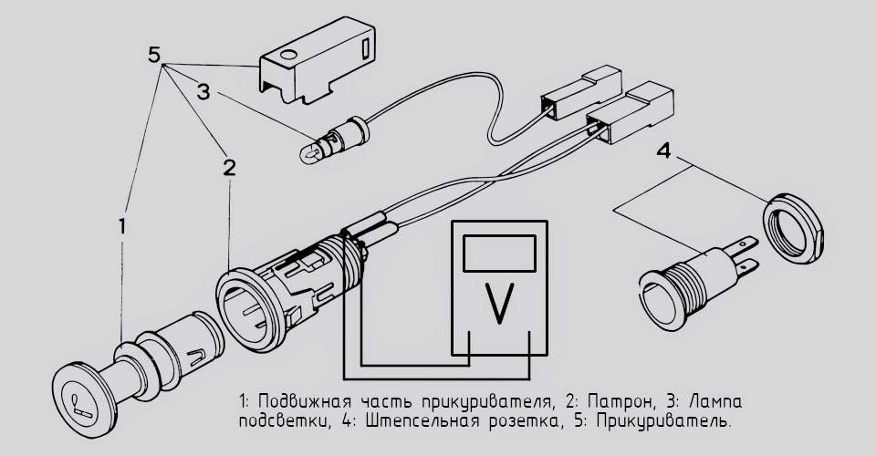 Прикуриватель в машине состоит из хромированного металлического корпуса, нагревательного элемента со спиралью из материала с высоким удельным сопротивлением (нихрома или подобного), пластмассовой рукоятки в виде кнопки и цилиндрической пружины внутри корпуса. Гнездом прикуривателя является стальной стаканчик с биметаллическим фиксатором нагревателя на торцевой стенке корпуса внутри. Общий провод электрооборудования авто (масса) подключается к корпусу гнезда прикуривателя, а питание (+) к фиксатору нагревателя. Для подсветки гнезда прикуривателя при недостаточной освещенности, на корпус устанавливается световод из прозрачного зеленоватого пластика, на который крепится патрон с небольшой лампочкой. Один ее контакт соединяется с корпусом гнезда, а другой с проводом, подачи питания на подсветку приборов.