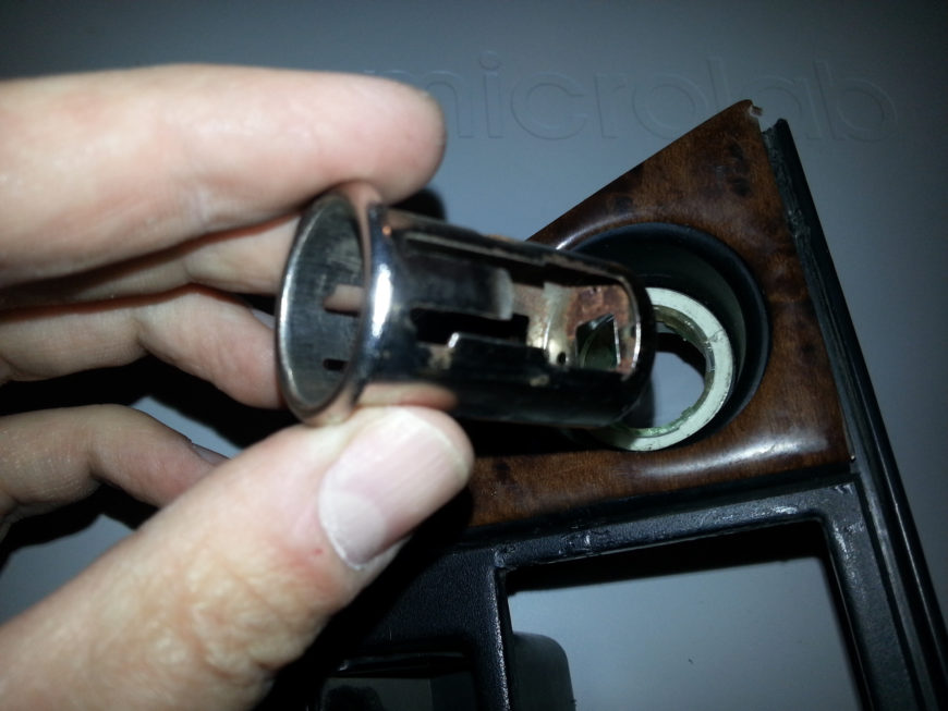 - Утопите пальцами или отверткой пластиковые фиксаторы гнезда и выньте корпус узла из отверстия консоли.