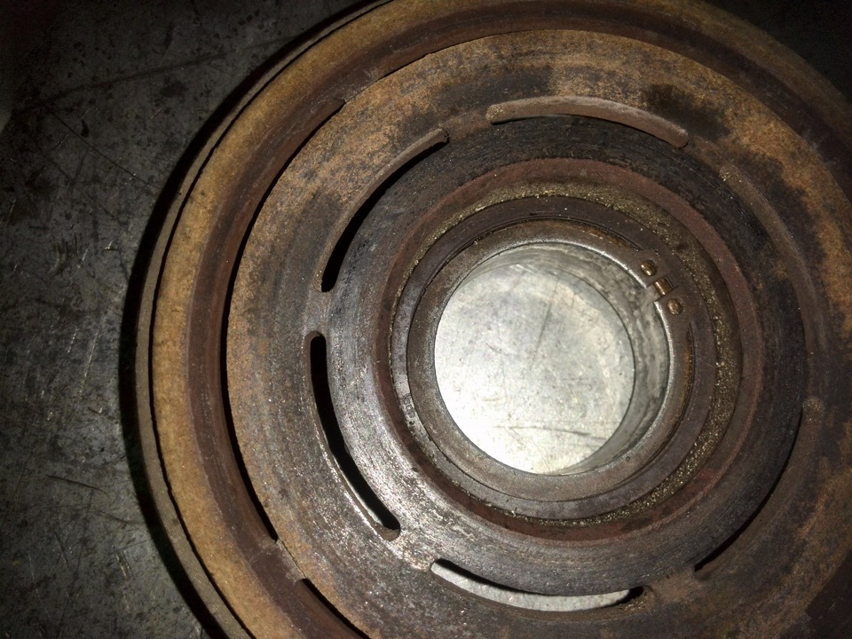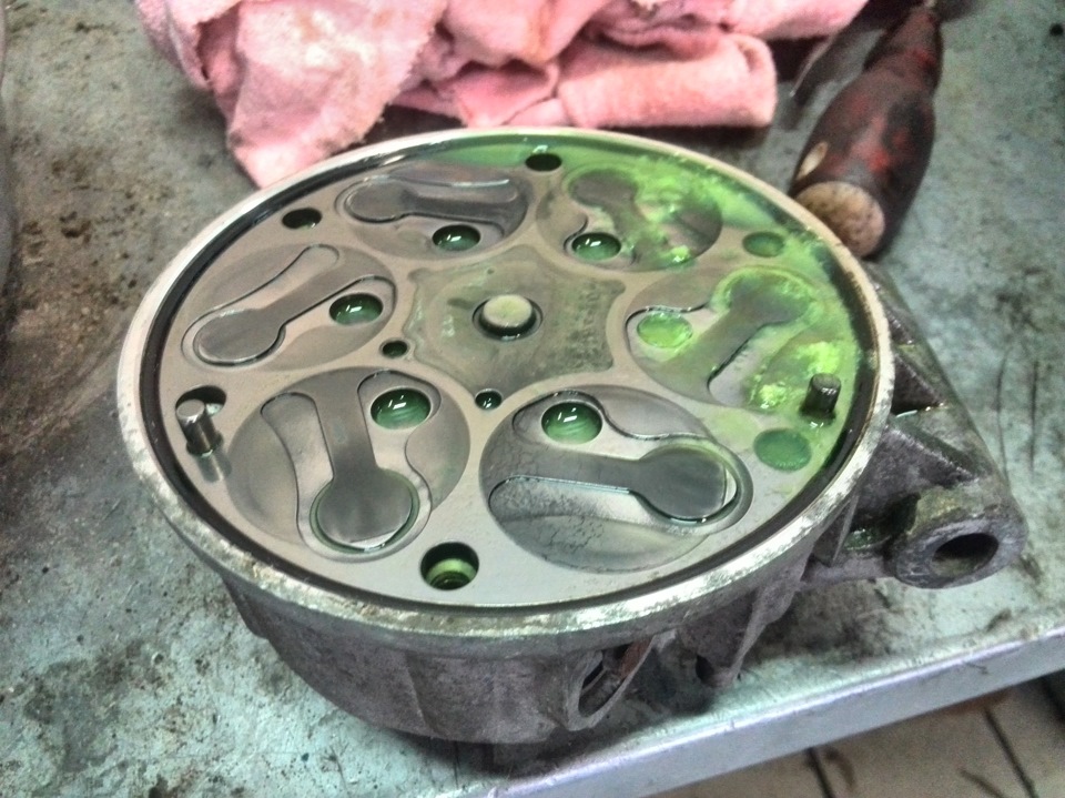 В итоге я обнаружил внутри компрессора, в масле, какую-то липкую субстанцию похожую на творог. Видно на фото задней крышки. Видно при нагреве эта липкость как клей приклеила все поршни к блоку цилиндров. Пришлось всё промывать и смазывать компрессорным маслом при сборке. Причём этот клей не отмывался бензином, а от нефраса стало ещё хуже. Даже то что ещё двигалось как будто замёрзло как только погрузил в нефрас. Зато два флакона карбюраторки сделали своё дело. Всё разобрал. Отмыл. Смазал. Собрал. Компрессор как новый. Рукой за вал проворачивается. Поставил на место. Заправили фреон. Всё работает. А дальше посмотрим.Да. Совсем забыл. При сборке, по хорошему, нужно уплотнения все и сальник менять. Но у меня их не было т.к. я вообще не думал что так легко отделаюсь. Вроде всё