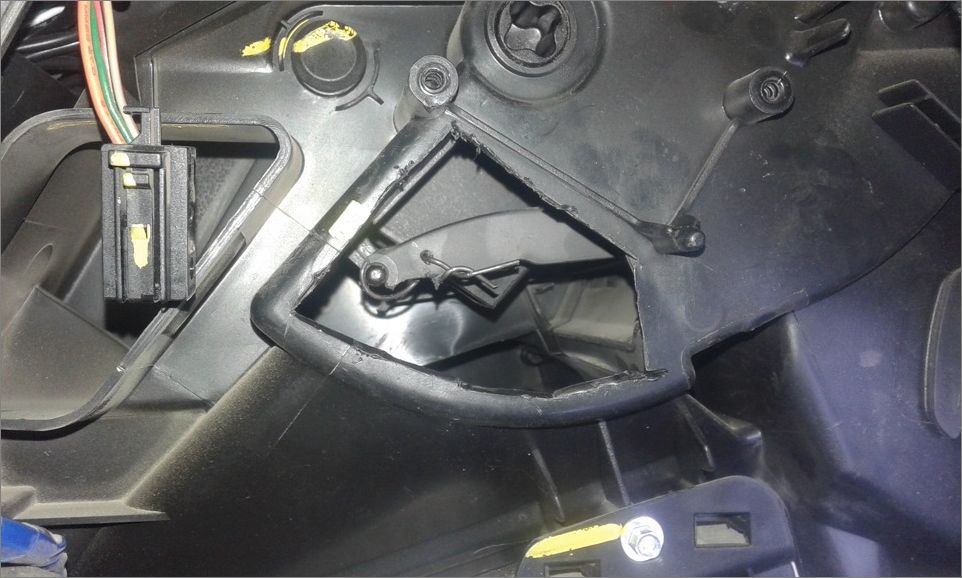 Через образовавшийся проём аккуратно выдавливается блок переключателей света. Это делается вручную, блок держится только за счёт боковых пазов (но слишком сильно давить не следует, поскольку края у блока пластиковые и могут легко сломаться).
