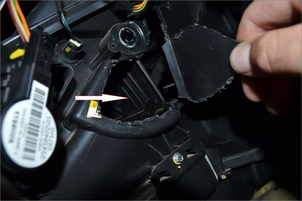 Под боковым кожухом расположен болт крепления подрулевой обшивки. Воздуховод пространства для ног крепится шурупом Демонтируйте воздуховод пространства для ног задних пассажиров. Воздуховод для ног задних пассажиров установлен враспор Отсоедините сервопривод заслонок печки. Для этого необходимо выкрутить два шурупа. Привод заслонки установлен непосредственно на корпусе печки Вырежьте стенку печки с помощью дрели и ножа. Нужно просто подключить его непосредственно к аккумулятору.