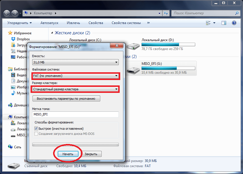 Откроется окно настроек форматирования. Тут вам нужно выполнить всего два действия: в выпадающем списке «Файловая система» выбрать вариант «FAT32» и нажать на кнопку «Начать».