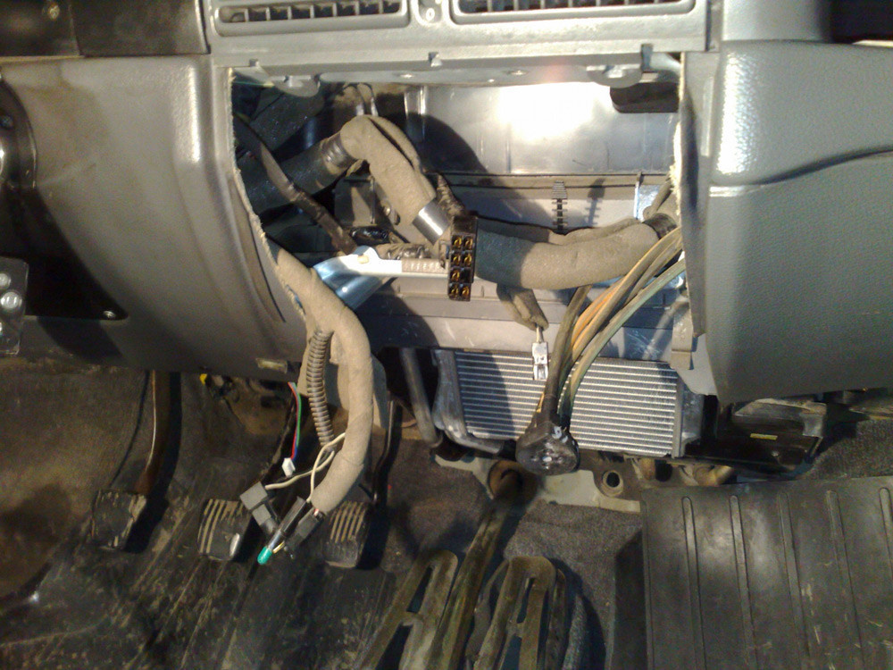 Вот и подошли к отопителю в сборе с радиатором и испарителем, его тоже отсоединяем: