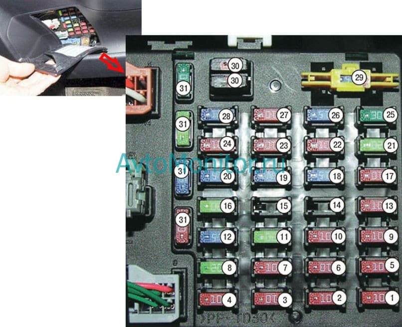| 29 | 15 | Выключатель фонаря заднего противотуманного света; Датчик контрольной лампы незакрытой двери; Аудиосистема; Диагностический разъем; Освещение салона и багажника |